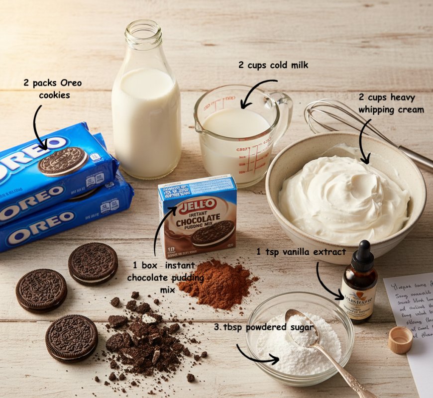 As it chills, something magical happens—the Oreos soak up the cream and pudding, turning into soft, cake-like layers that melt in your mouth. When you’re ready to serve, sprinkle crushed Oreos on top, drizzle chocolate syrup, or even add chocolate curls for a fancy finish.