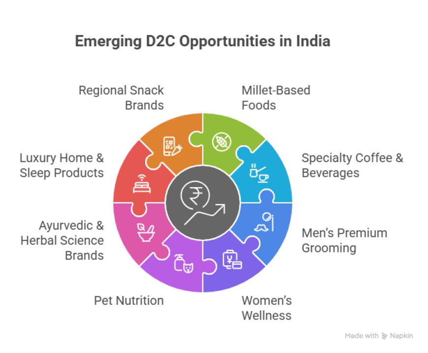 Why? Because the next generation of D2C brands won’t compete in the discount-driven mass market. Instead, they will emerge in ₹100–500 crore premium niches such as: