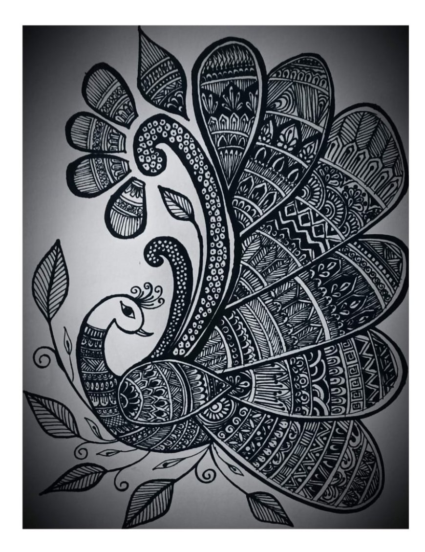 Notice how each feather segment contains a unique set of patterns. I used thicker lines to outline the major shapes of the peacock and leaves, which makes the intricate black-and-white patterns pop. The use of simple dotwork on the neck and head provides a contrast to the dense patterns on the tail.