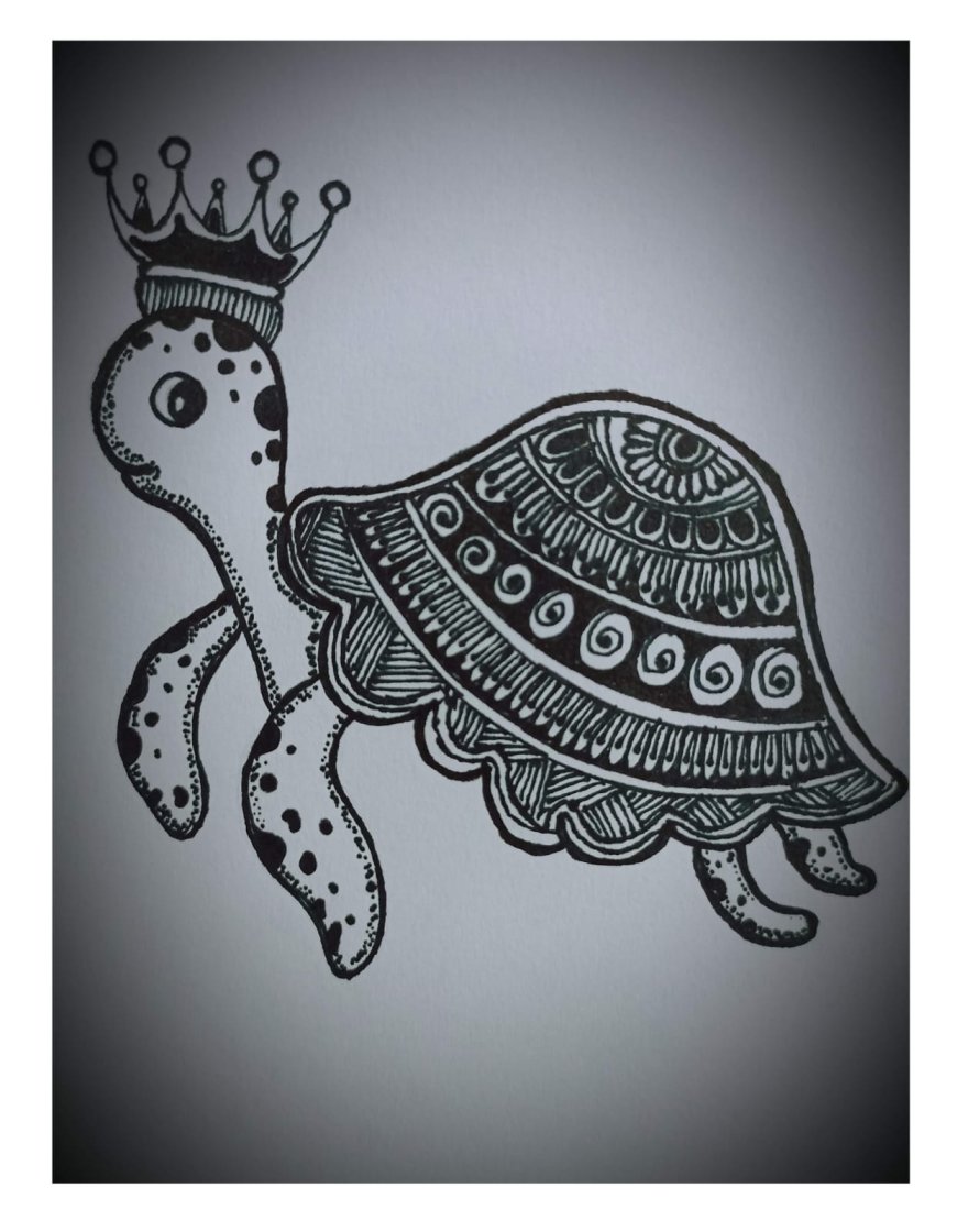 The turtle's shell serves as the primary canvas for the central mandala design. I kept the head and flippers free of complex patterns but added simple spotwork to give them texture, ensuring the eye is drawn to the detailed shell and the whimsical crown on its head.