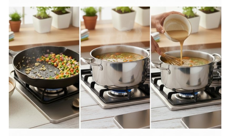 Pour in the water or vegetable broth and stir well. Add salt and black pepper powder to season the base. Bring the mixture to a boil, then lower the flame and let it simmer for around five minutes until the vegetables are fully cooked and tender. This creates the light, flavorful broth that forms the foundation of the soup.